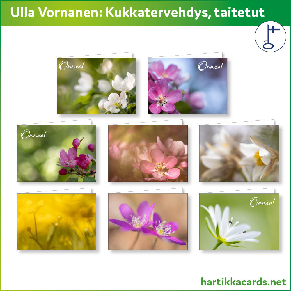 Ulla Vornaselta on nyt julkaistu sarja Kukkatervehdys sekä postikortteina että taitettuina kortteina. Osassa taitetuista on myös teksti Onnea. Kuvien herkkä utuisuus ja heleät värit juhlistavat juhlan ja sulostuttavat arjen! Linkit: postikortit Korttikaupassa ja Tukussa; taitetut Korttikaupassa ja Tukussa.