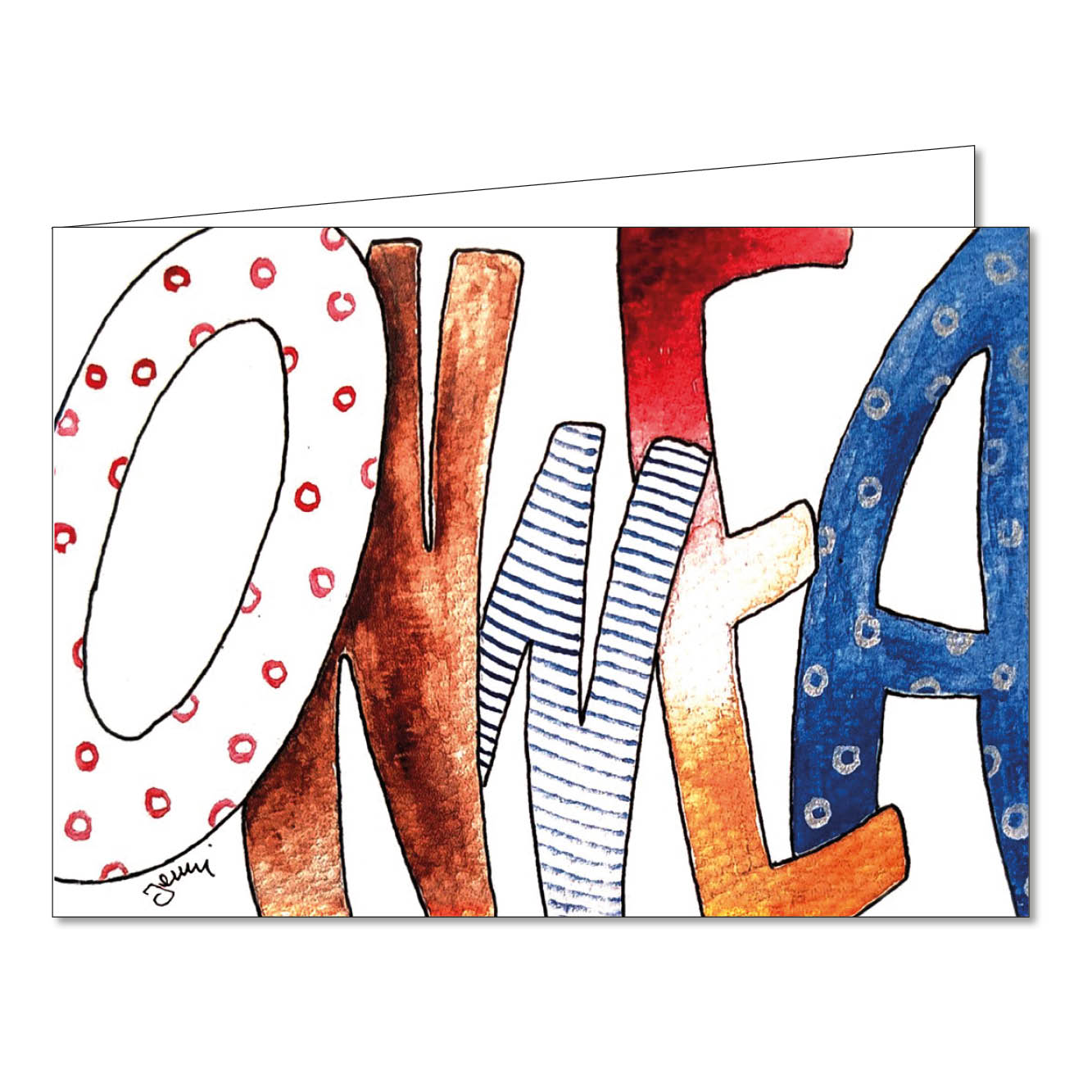 Taitettu kortti. Kortti on painettu korkealaatuiselle 300 g valkoiselle korttikartongille. Koko on taitettuna A6 (148 x 105 mm). Kuvapuoli on kevyesti kiillotettu ja sisäpuoli matta, ei tekstiä. Takasivulla kuvan ja taiteilijan nimi sekä Hartikka Cards & Posters -logo.